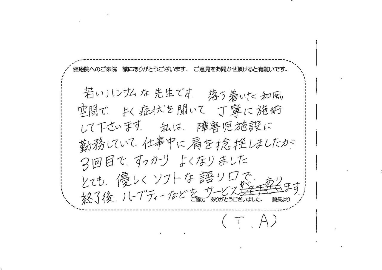 若くて知識が豊富な若い先生です。落ち着いた和風空間でよく症状を聞いて下さいます。私は障害児施設に勤務していて仕事中に肩を捻挫しましたが3回目ですっかりよくなりました。とてもソフトで優しい口調で、予防や運動の仕方を説明してくださいました。施術後、ハーブテイ―などのサービスがあります。